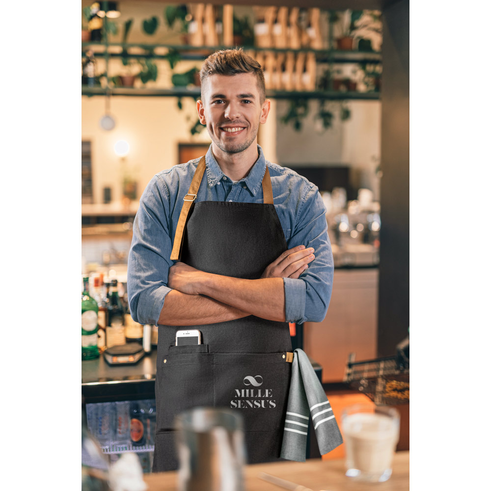 Avental 100% algodão canvas (300 g/m²) com detalhes em metal. Com 3 bolsos multifuncionais e uma tira lateral (para suporte de um pano de cozinha). Tira do pescoço facilmente ajustável. 680 x 900 mm