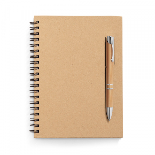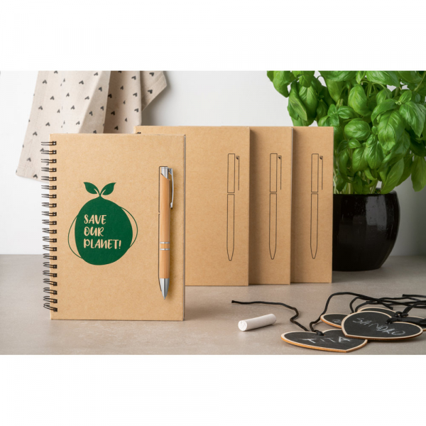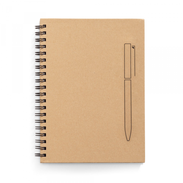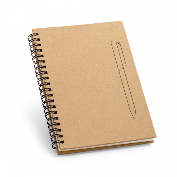 Caderno B6 espiral com capa dura em papel kraft e 70 folhas não pautadas em papel pedra de 120 g/m². Imã na capa que funciona como um suporte de esferográfica (não inclusa). 130 x 180 mm