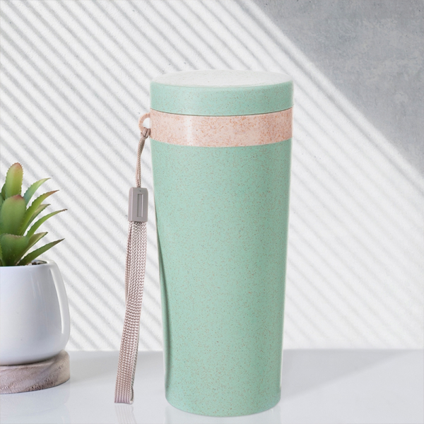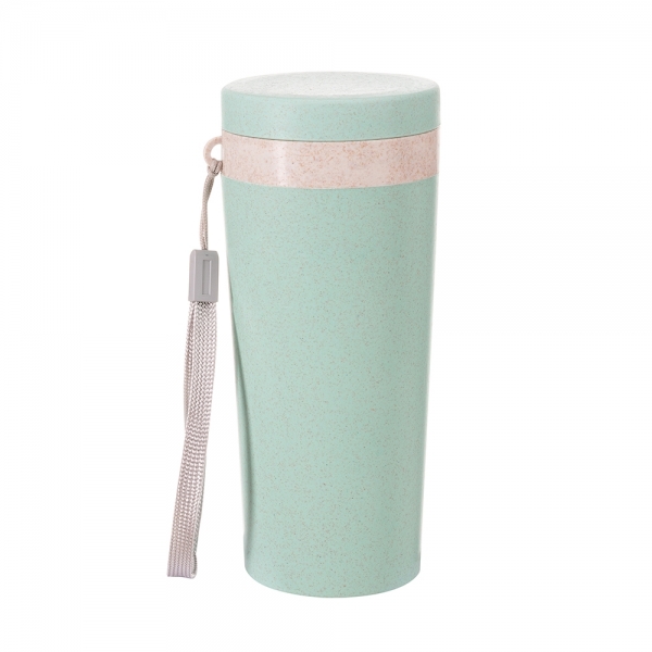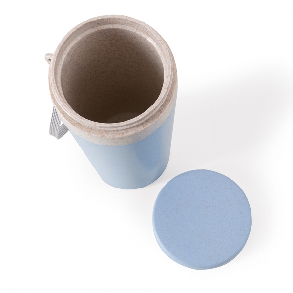 Copo térmico de fibra de bambu de 350ml com alça. Copo produzido em Polipropileno livre de BPA, possui uma tampa de vedação rosqueável e alça de nylon (removível) para transporte. O copo pode ser levado a lava-louças, geladeiras e micro-ondas.