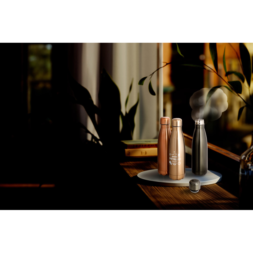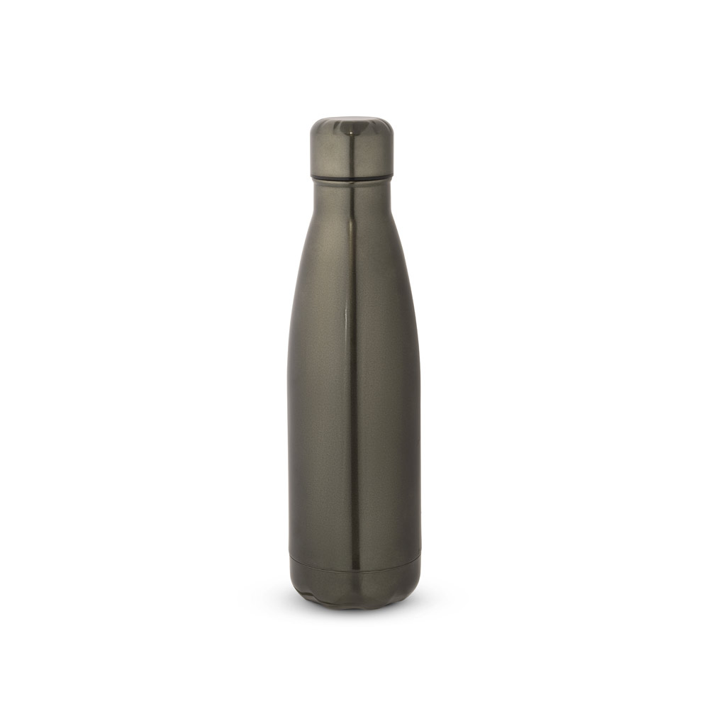 Garrafa com acabamento metalizado e tampa em aço inox.