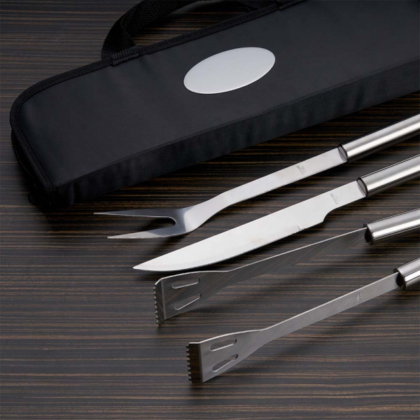 Kit Churrasco 9 Peças em estojo de nylon com alça. Contém: pegador, garfo, espátula, faca, pincel e 4 espetos. Utensílios de inox com proteções plásticas e parte interna com velcro para fixação das peças, acompanha plaquinha metálica para personalização.