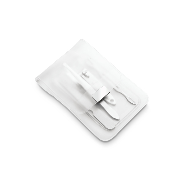 Kit manicure 4 peças contendo lixa, cortador, pinça e afastador de cutícula. Fornecido com bolsa de PVC. 66 x 105 mm