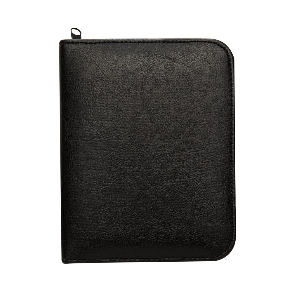 Estojo de couro sintético, parte interna revestida com plástico em relevo e elástico para fixação dos itens.