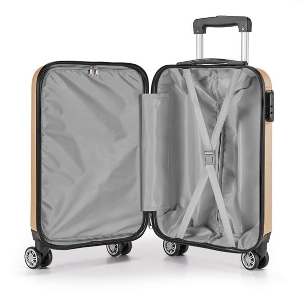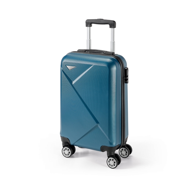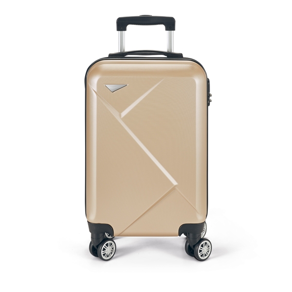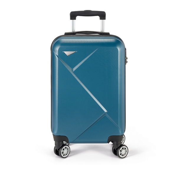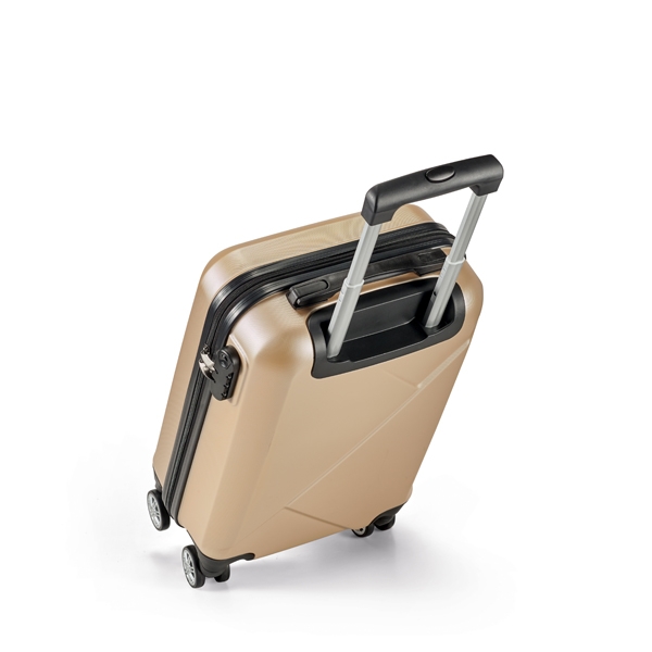 Mala de viagem executivo. ABS. Interior forrado, com divisória. 4 rodas duplas giratórias. Pega extensível em metal, com mola (altura pega estendida até 530 mm). Fecho de segurança com senha. Placa metálica removível, para fácil gravação. Capacidade até 34 L. Peso: 2,50 kg. 345 x 540 x 220 mm | Placa: 60 x 20 mm