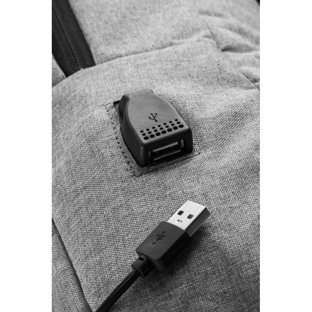 Mochila para notebook em 300D melange. Inclui 1 compartimento principal com bolso interior forrado compatível com computador até 15,6″ e diversos bolsos multifuncionais. A mochila tem 2 bolsos frontais, 1 lateral e entrada USB. A parte posterior e alças são almofadadas. 300 x 410 x 110 mm