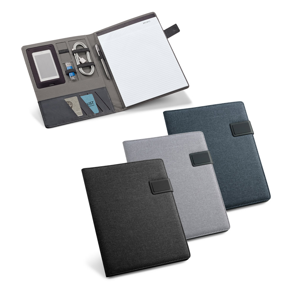 Pasta A4 em linho e couro sintético, com fecho magnético e bloco com 20 folhas pautadas. Placa metálica com acabamento emborrachado. Acessórios não inclusos.