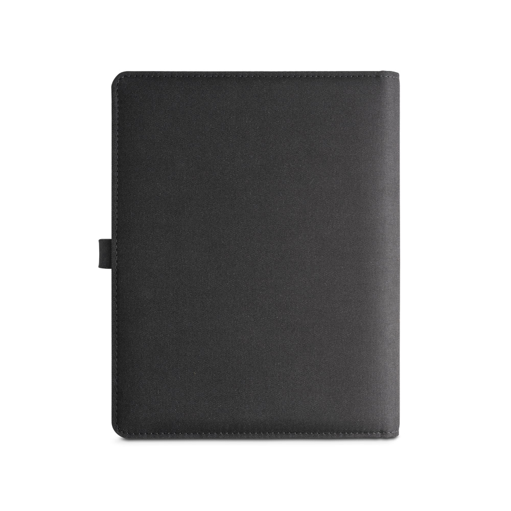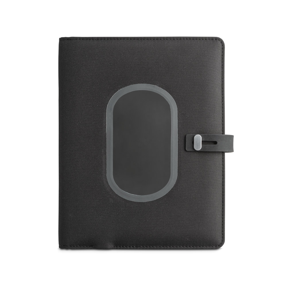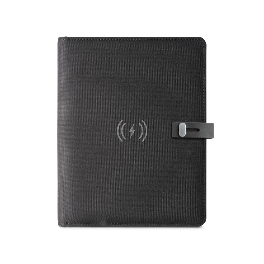 Pasta A5 em 300D rPET com carregador wireless embutido. A bateria tem capacidade para 5.000 mAh, potência de 10W, entrada/saída 5V/2.1A e cabo USB tipo C para carregar a bateria. A pasta contém no seu interior um bolso para smartphone até 6.5”, três espaços para cartões, quatro luzes LED, botão on/off, suportes para esferográfica (não incluída), celular e cabo USB, um bloco de notas com capa em cartão preto e 64 folhas pautadas de cor marfim, em papel proveniente de gestão florestal sustentável. Na frente existe ainda uma impressão oval em preto para indicar a área de carga do wireless. Fornecido em caixa presente. 165 x 225 x 25 mm.