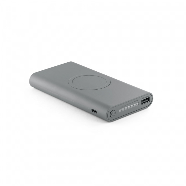 Bateria portátil em ABS com acabamento emborrachado que permite o carregamento do dispositivo por indução. Bateria de lítio com capacidade de 10.000 mAh e tempo de vida ? 500 ciclos. Com entrada/saída 5V/2.1A e potência de carregamento de 5W. Indicador de carga e portas USB, micro USB e USB tipo C. Incluso cabo USB/micro USB para carregar a bateria. Compatível com smartphones com tecnologia de carregamento sem fios. Fornecida em caixa presente. 135 x 75 x 20 mm | Caixa: 150 x 95 x 25 mm