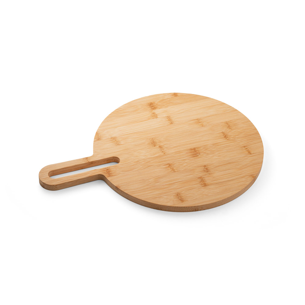 Tábua de servir redonda em bambu com pega, de grande dimensão e de utilização versátil. Ideal para pizza. Certificação EU Food Grade. Fornecido com caixa presente de papel kraft. 310 x 408 x 12 mm